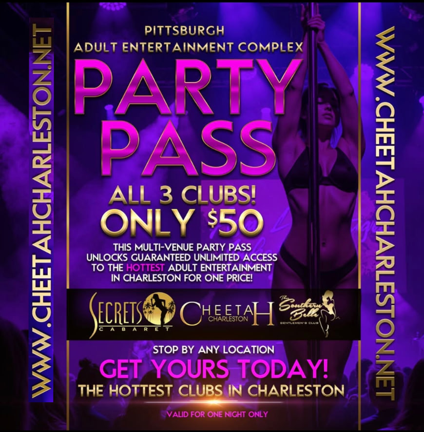 This pass unlocks guaranteed unlimited access to the hottest Adult Entertainment in Charleston. Have the time of your life at the Pittsburgh Adult Entertainment Complex. Access three clubs for one price – this includes Cheetah Charleston, Secrets Cabaret and Thee Southern Belle.